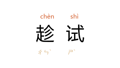 引五代 王定保 《唐摭言·误放》:“包谊 者, 江 东人也,有文辞。初与计偕,到京师后时,趁试不及。”宋 洪迈 《夷坚甲志·沉持要登科》:“十六日早,抵 吴兴 城下,见白袍纷纷往来,问之。云:‘昨日已入举场,而试卷遇暴雨多沾渍,须易之,移十七日矣。’ 沉 遂得趁试。”