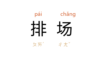 ⒊ 旧时不上戏的演员坐在戏台的两旁亮相,以广招徕,称为「排场」。