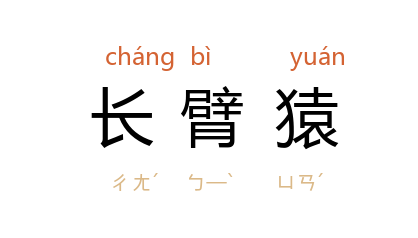 ⒈ 哺乳纲,灵长目,长臂猿科。因前臂特别长而得名。能用双臂钩住树枝,交替向前运动。无尾和颊囊。喉部音囊发达,善于鸣叫。中国产的有黑长臂猿、白眉长臂猿和白掌长臂猿,都是国家一级保护动物。