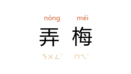 引唐 李白 《长干行》之一:“妾髮初覆额,折花门前剧。郎骑竹马来,遶牀弄青梅。”因以“弄梅”喻男女儿童间的天真亲昵。 宋 陈亮 《柳梢青》词:“鬭草风流,弄梅情分,教人思忆。”