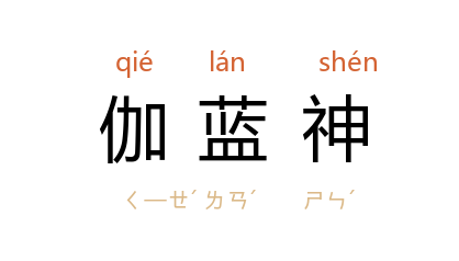 ⒈ 佛教寺院中的护法神。佛典原谓有 美音、梵音、雷音、师子 等十八神护伽蓝。禅宗寺院则供当山土地等为守护神。后世又以 智顗 建 玉泉寺 时见 关羽 幻象的传说而将 关羽 列为伽蓝神。