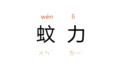 引唐 冯宿 《为马总尚书谢除彰义军节度使表》:“彩章五色,虔奉璽书,赏罚二权,猥操兵柄,鸿私荐及,蚊力何堪。”唐 李绅 《和晋公》之一:“凤仪常欲附,蚊力自知微。”宋 王禹偁 《谪居感事》诗:“蚊力山难负,鵜梁翼易滋。”
