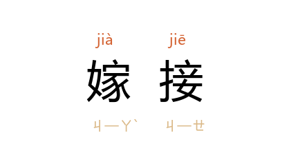 ⒈ 一种植物无性繁殖和改良品种的方法。以人为方式,将一植物的枝或芽接到另一植物体上,使其愈合来营共生的操作,而结成为一个独立生长的新植株。此法能保持植物原有的某些特性,常用来改良品种。多用于果树的栽培。