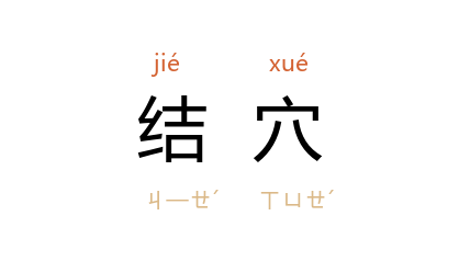 ⒉ 术数用语。堪舆家以地面洼突,为地气藏蓄之所,称为「结穴」。
