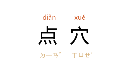 ⒉ 术数用语。堪舆家称地脉停落之处「龙穴」,择龙穴结聚之处为墓地,称为「点穴」。
