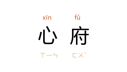 引南朝 梁 慧皎 《高僧传·义解三·道融》:“迄至立年,方解英絶,内外经书,闇游心府。”《隋书·高祖纪下》:“王公卿士,每日闕庭,刺史以下,三时朝集,何尝不罄竭心府,诫勅殷勤。”《再生缘》第六六回:“心府冲融方寸静,暗暗的,前思復想细评章。”丁玲 《在医院中》三:“然而在心府里,三个人同样讨厌着那善于周旋的女人。”