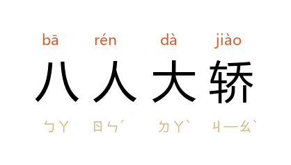 引《红楼梦》第五三回:“﹝ 贾母 等﹞先坐八人大轿,带领众人进宫朝贺行礼。”老舍 《四世同堂》二四:“假如他早生三二十年,他一定承袭上一等侯爵,而坐着八人大轿去见皇帝的……他吃,喝,玩,笑,象一位太子那么舒适。”