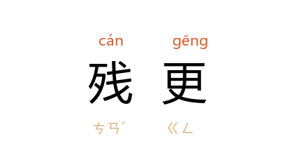 引唐 沉传师 《寄大府兄侍史》诗:“积雪山阴马过难,残更深夜铁衣寒。”宋 刘克庄 《风入松·癸卯至石塘迢和十五年前韵》词:“残更难睚抵年长,晓月凄凉。”明 顾梦游 《乙酉除夕》诗:“壮心真共残更尽,泪眼重将旧历看。”