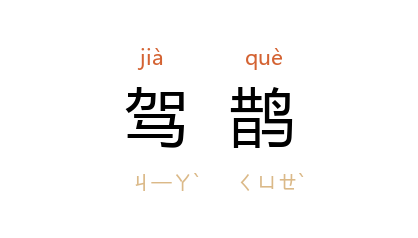 ⒈ 传说牛郎、织女分居天河两岸,每年七夕,喜鹊飞临天河,汇聚成桥,使之相会。事见《岁华纪丽·七夕》注引汉应劭《风俗通》。后因以“驾鹊”为七夕的典实。