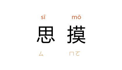 引焦祖尧 《时间》:“季艾水 思摸了好几个晚上,决定把儿子调到自己身边来工作。”梁斌 《播火记》三六:“朱大贵 两腿硌蹴在地上,用烟锅划着地,思摸来思摸去,说:‘爹!你带着队伍在这里等等,我上前边去看看!’”