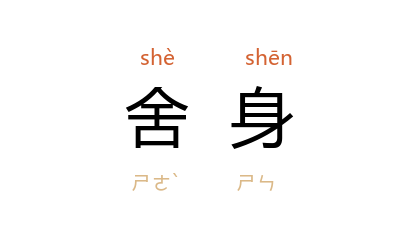 本指佛教徒牺牲自己的肉体,以表示佛法的大慈大悲的精神。后亦用于为国家、人民和正义事业而牺牲自己。 陈去病 《辑<陆沉丛书>初集竟题首》诗:“誓死肯从穷髮国,舍身齐上断头臺。”