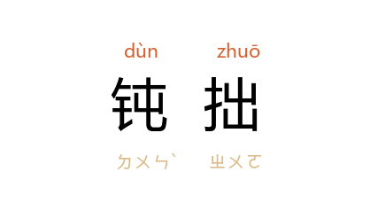 引北齐 颜之推 《颜氏家训·名实》:“有一士族,读书不过二三百卷,天才钝拙,而家世殷厚。”唐 李绅 《七年初到洛阳寓居》诗:“惟有门人怜钝拙,劝教沉醉洛阳春。”明 刘基 《杂诗》之八:“胡为化为鳩,钝拙无与匹。”王西彦 《死在担架上的担架兵》:“造成他这种地位的,并不是由于他的聪明机警,而是由于他的钝拙和近乎可笑的忠诚。”