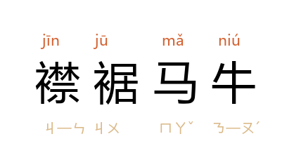 ⒈ 襟、裾,泛指衣服。襟裾马牛指马牛穿上人的衣服。比喻没有头脑和无知的人。元·汪元亨〈朝天子·新诗吟兴浓套〉:「厌襟裾马牛,笑衣冠沐猴。」也作「裾马襟牛」。