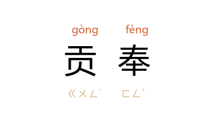 引《后汉书·班超传》:“今 西域 诸国,自日之所入,莫不向化,大小欣欣,贡奉不絶。”《新五代史·杂传十七·卢文纪》:“自 唐 衰,天子微弱,诸侯彊盛,贡奉不至。”《红楼梦》第七九回:“凡这 长安,那城里城外桂花局,俱是他家的;连宫里一应陈设盆景亦是他家贡奉。”