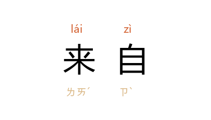 ⒈ 表示来源,但通常不带有肇始之意,而指从原有的以另一形式存在的人或物,通过赋与、移转、演绎、模仿或再生而发生。
