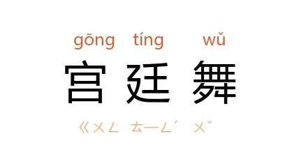 ⒈ 皇室贵族宴享娱乐或祭祀用的舞蹈。大多取材于民间,经过宫廷艺人加工而成。形式华丽,风格严谨。