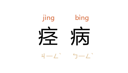引《医宗金鉴·张仲景<伤寒论·痉湿暍病>》:“病身热足寒,颈项强急,恶寒,时头热面赤,目脉赤,独头面摇,卒口噤,背反张者,痉病也。”注:“风寒客于二经,则有头摇、口噤、反张、拘强之证,故名痉病也。”《医宗金鉴·杂病心法要诀·痉病总括》:“痉病项强背反张,有汗为柔无汗刚。”