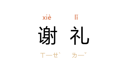 ⒈ 表达谢意的财物。唐·戴叔伦〈李大夫见赠因之有呈〉诗:「谢礼诚难答,裁诗岂易酬。」也作「谢仪」。