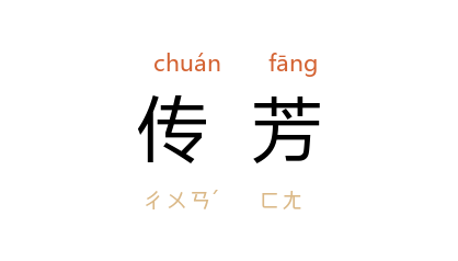 引《晋书·元帝纪论》:“岂 武 宣 餘化犹畅于 琅邪,文景 留仁传芳于 南顿。”唐 李百药 《笙赋》:“覬传芳於风雅,将永代於刊勒。”《金史·时青传》:“生还父母之邦,富贵终身,传芳后世。”