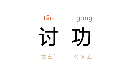 引清 陈天华 《猛回头》:“那人家的子孙,若是有一半倒要帮这个强盗,把自己的亲兄弟杀害了,到那强盗处讨功,这还算得一个人呢?”《文汇月刊》1984年第9期:“另一位青年飞步去接,(鸭蛋)刚好滚在他的手里,他嘻笑着向胖子讨功。”