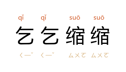 引《金瓶梅·第七二回》:「想著一来时,饿答的个脸,黄皮儿寡瘦的,乞乞缩缩那等腔儿。」《儒林外史·第三回》:「这时已是十二月上旬,那童生还穿著麻布直裰,冻得乞乞缩缩。」