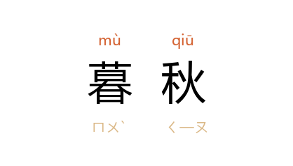 引三国 魏 曹植 《迷迭香赋》:“芳暮秋之幽兰兮,丽 崑崙 之芝英。”《初学记》卷三引 南朝 梁元帝 《纂要》:“九月季秋,亦曰暮秋。”《说唐》第三回:“这时正值暮秋天气,西风颯颯。”冯至 《伍子胥》七:“时节正是暮秋,但原野里的花草,仍不减春日的妩媚。”