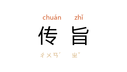 引唐 王建 《宫词》之六十一:“中官传旨音声散,诸院门开触处行。”《京本通俗小说·菩萨蛮》:“郡王见了大喜,传旨唤出 新荷姐,就教他唱 可常 这词。”明 何良俊 《四友斋丛说·史三》:“太监 梁芳 进淫巧以荡上心……夤缘传旨与官。”