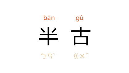 ⒈  《孟子·公孙丑上》:“故事半古之人,功必倍之,惟此时为然。”赵岐注:“当今所施恩惠之事半于古人,而功倍之矣。”后以“半古”谓才能或功业仅及古人的一半。