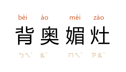⒈ 借喻背着君上而阿附权臣。语出《论语·八佾》:“与其媚于奥,宁媚于灶。”朱熹集注:“室西南隅为奥。灶者,五祀之一,夏所祭也……喻自结于君,不如阿附权臣也。”