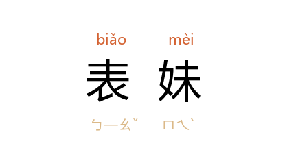 ⒈ 称谓。用以称姑妈、姨妈、舅舅的女儿,且年纪比自己小。