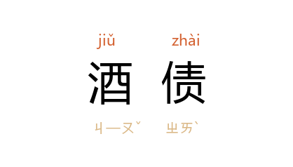 引汉 孔融 《失题》诗:“归家酒债多,门客粲几行。高谈满四座,一日倾千觴。”唐 杜甫 《曲江》诗之二:“酒债寻常行处有,人生七十古来稀。”清 赵翼 《郡城菊事甚盛》诗:“间日必一集,一集必竟日;那顾酒债增,但恐花事毕。”