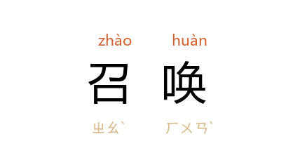 引刘白羽 《写在太阳初升的时候·第一封》:“一个穿黑斜纹布棉制服的干部走过,他忽然发现了他,立刻召唤他,那人一见老人,也立刻高兴地跟他握手,谈话。”峻青 《海啸》第一章:“那在小河旁边被匪徒们杀害的同志,在召唤她复仇,战斗,狠狠地打击敌人!”胡乔木 《车队》诗:“希望在燃烧,未来在召唤。”
