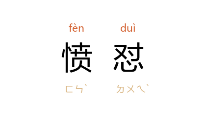 引《隶释·汉陈球后碑》 宋 洪适 释:“两碑之前,几二百字可读,其末则文字凋落如晨星相望,岂其间盖有愤懟哀切之语,后来益有所愳而剔之乎?”明 刘元卿 《贤奕编·官政》:“而上或吾格,如不耐烦,则愤懟之心生,上下之情暌矣。”王闿运 《御夷论一》:“强者愤懟而不知救祸之道,弱者输服而不知坐亡之惨。”