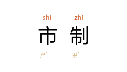 ⒈ 我国人民习用的计量制度。亦称“市用制”。市制的主要单位及其与法定计量单位等的关系如下:长度单位,一市尺等于一米的三分之一。重量、质量单位,一市斤等于五百克。容量单位,一市升等于一升。按,国务院于1984年规定,我国的计量单位一律采用《中华人民共和国法定计量单位》,目前采用的市制计量单位,可以延续使用到1990年。
