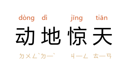 引元 关汉卿 《窦娥冤》第三折:“不隄防,遭刑宪,叫声屈动地惊天。”《再生缘》第六五回:“那时勾合皇亲府,动地惊天闹起来。”粤剧《关汉卿》第七场:“你那些剧本啊,一部部动地惊天泣鬼神。”