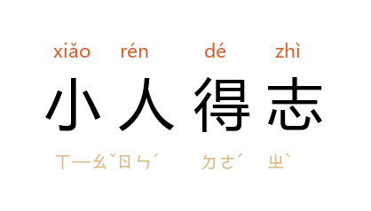 引《大宋宣和遗事·元集》:「阴浊用事底时节,夷狄陆梁,小人得志,在天便有彗孛日蚀之灾,在地便有蝗虫饥馑之变,天下百姓,有流离之厄。」《官场现形记·第三八回》:「至于内里这位宝小姐,真正是小人得志,弄得个气燄薰天,见了戴世昌,喝去呼来,简直像他的奴才一样。」
