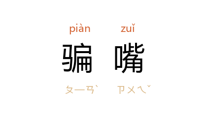 引元·无名氏《鞭打单雄信》:「著我掠阵,我便跟的老单去,若著我厮杀,其实不敢骗嘴,一定送了这条性命。」《金瓶梅·第三三回》:「头里骗嘴,说一百个二百个,才唱两个曲儿,就要腾翅子,我手里放你不过。」