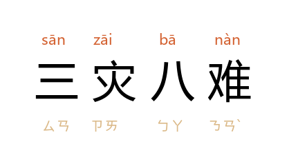 ⒈ 三灾,原指佛教所说的大小三灾。八难,原指影响佛求道的八道障碍。三灾八难后用以形容多病痛、多灾难。