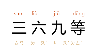 引《红楼梦》第七五回:“只不过这会子输了几两银子,你们就这么三六九等儿的了。”老舍 《骆驼祥子》十三:“同是拉车的,为什么有三六九等呢?”