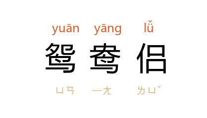 引唐 温庭筠 《偶游》诗:“与君便是鸳鸯侣,休向人间觅往还。”元 王元和 《小桃红·题情》套曲:“我一从儿见了那箇妖嬈,他便和咱燕鶯期,凤鸞交,鸳鸯侣,只引的蜂蝶儿闹也。”《檮杌闲评》第二二回:“这正是:十年拆散鸳鸯侣,今日重逢锦綉窝。”