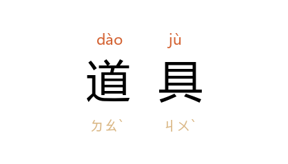 ⒉ 演剧或摄制电影时表演用的器物。通常分:大道具(如桌、椅、屏风等)、小道具(如杯、壶、文具等)、装饰道具(如镜框、书画、古玩等)、随身道具(如眼镜、烟盒、扇子等)。
