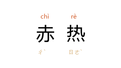 例如:「这种赤热的天气,让人只想躲在冷气房里。」、宋·文同〈鸣玉亭筹笔之南〉诗:「坐可脱赤热,听宜彻清夜。」
