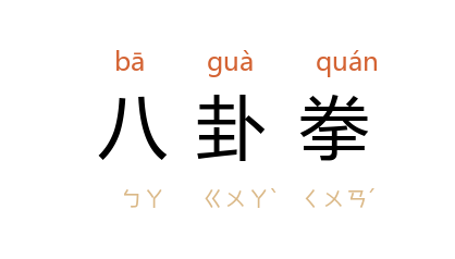 ⒈ 一种拳术。相传由清乾隆年间河北文安县人董海川创始。拳法按八卦的四正四偶和九宫步运行,结构多取掌式,分上、中、下三盘,一拳护内,一掌应敌。演练时需顺项提顶,松肩沉肘,实腹畅胸,曲腿蹚泥。也作「八卦掌」。
