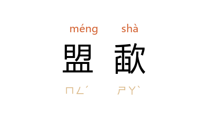 引南朝 陈 徐陵 《武皇帝作相时与北齐广陵城王书》:“若彼鬼神有知,寧可斯背;鬼神无知,何用盟歃。”唐 杜甫 《草堂》诗:“中宵斩白马,盟歃气已麤。”唐 权德舆 《读<穀梁传>》诗之一:“羣臣自盟歃,君政如赘旒。”清 吴伟业 《矾清湖》诗:“草草十数人,盟歃起里閭。”
