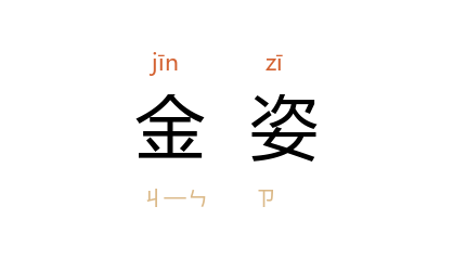 引《文选·王屮<头陀寺碑文>》:“金姿寳相,永籍闲安。”吕延济 注:“金姿寳相,言佛之灵象也。”南朝 梁 萧统 《会旨解法身义》:“金姿丈六,亦是法身。”明 许三阶 《节侠记·订访》:“礼金姿,瞻寳相,百道毫光,映七寳雕牀闪闪。”