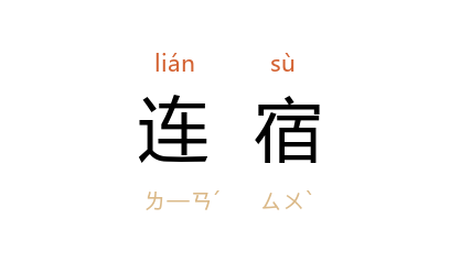 引清 曹晟 《夷患备尝记》:“并有大胆男子仍返故居,连宿过夜。”杨朔 《中国人民的心》:“千里迢迢,也要托人捎去做娘的连宿打夜带着灯做的老山鞋,还要在信上千叮咛万叮咛,就怕儿子晚上睡觉不盖被,受了凉。”