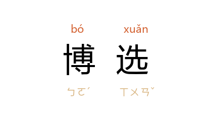 引《鹖冠子·博选》:“贤圣者以博选为本者也,博选者以五至为本者也。”《战国策·燕策一》:“王诚博选国中之贤者,而朝其门下……天下之士必趋於 燕 矣。”《后汉书·和帝纪》:“博选术艺之士,以充其官。”