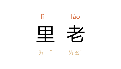 引元 无名氏 《陈州粜米》第三折:“那官人里老安排的东西,他看也不看。”明 沉榜 《宛署杂记·奶口》:“与其责之里老,而致其雇选相欺,孰与实令坊廓,悉选所有而送之乎?”清 余敏绅 《饥民谣》:“詔令减价更賑荒,里老奉行开户口。”