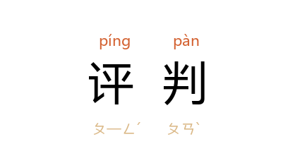 例如:「本班这次辩论会,我们请邱老师来评判。」、「他担任本届选美比赛的评判工作。」