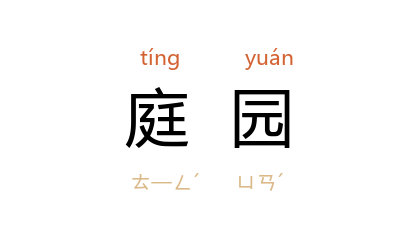 ⒈ 与住宅相连的一块土地,通常把其全部或一部分用来种植果树、花草或蔬菜以供家用或相应地添置设备或建造建筑物以供休息。